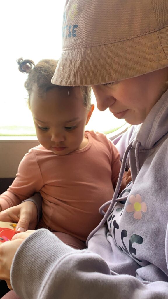 På det næste tog var der opdelt i hyggelige kupeer med en gang udenfor, som Eloise kunne bevæge sig frit langs. Vi vidste ikke, hvordan det ville være at rejse med barn, men det var meget nemmere, end vi havde troet. Første og eneste gang vi brugte bøger og legetøj, som vi havde taget med, var på dette tog. Så det havde vi faktisk ikke så meget brug for. I stedet var det godt nok at bare sidde på skødet, kigge på folk, gå langs gangene eller lege med aviser eller ting, der var på toget.