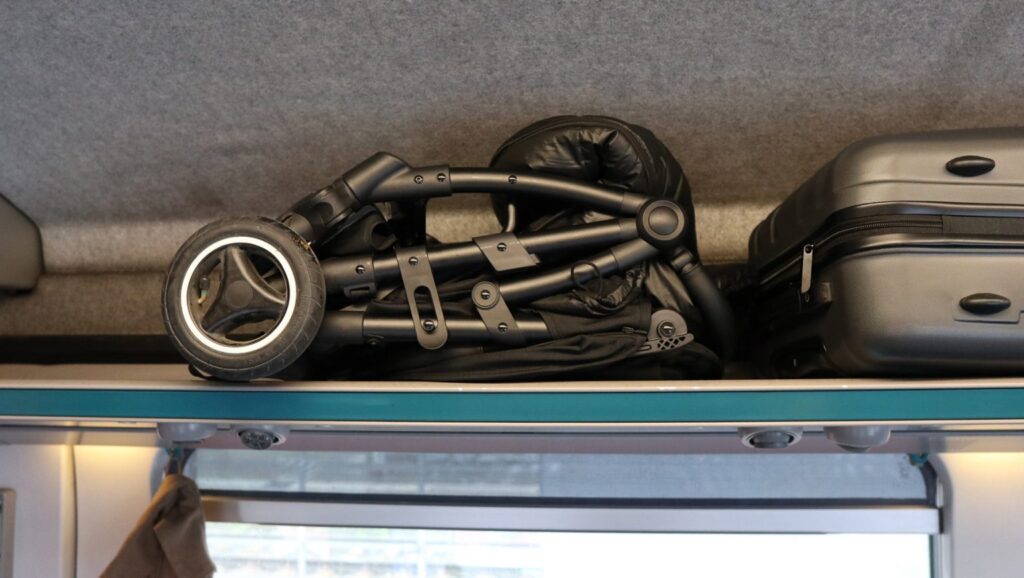 Vores bedste tip! En barnevogn, der nemt kan foldes sammen for nem på- og afstigning på toget og som nemt kan bæres op og ned ad trapper under rejsen. Vores vogn passede let på togets bagagehylde og havde en højde på 25 cm, længde på 60 cm og bredde på 50 cm.